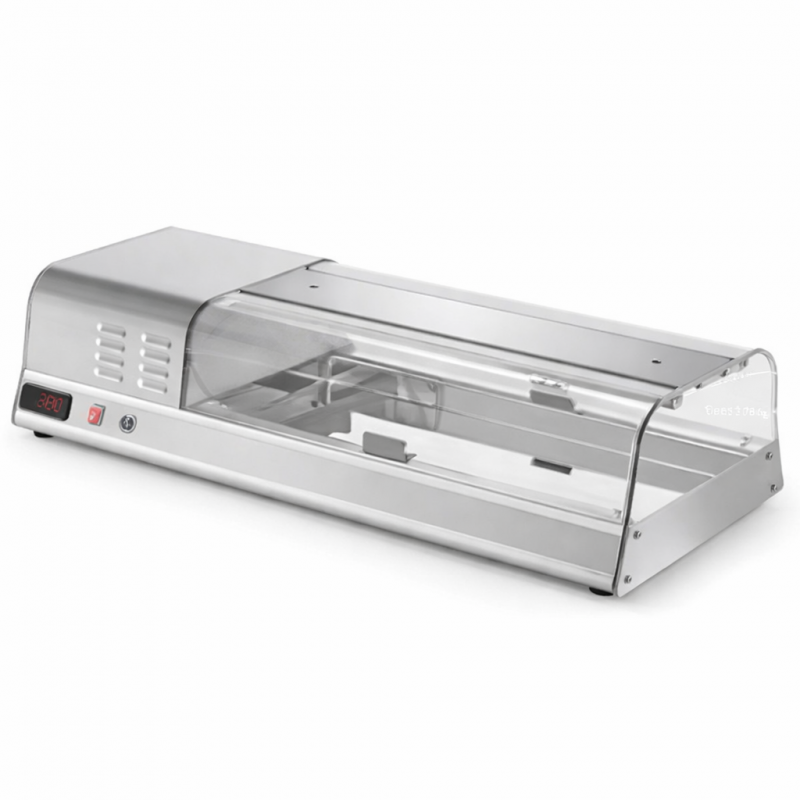 Struttura in alluminio anodizzato con inserti in acciaio inox Ante in plexiglass trasparente antiurto con apertura su entrambi i lati. Vasca stagna refrigerata in acciaio inox. Temperatura min. 3° C. Termostato digitale con visualizzatore temperatura. Gas R134A. - Vaschette non comprese. Led di illuminazione da 20 watt. Capacità: 2 vaschette 1/2 gastronorm h. 40 mm